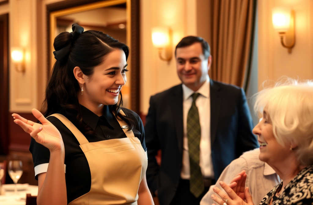 A senhora Almeida correu para a mesa principal. “Senhor Ramos, que honra!” Mas Joana notou algo—Dona Isabel não acompanhava a conversa. Quando entregaram o vinho, ela permaneceu distante. Foi então que Joana, reconhecendo a expressão que via em Beatriz, fez algo inesperado—usou língua gestual.